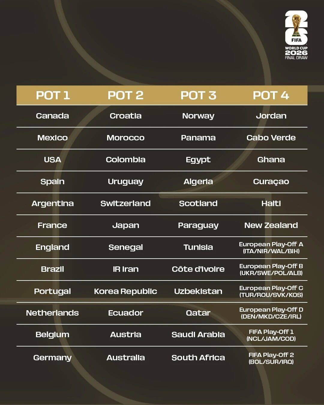 第四档:约旦、佛得角、加纳、库拉索、海地、新西兰、欧洲附加赛A、B、C、D组胜者、洲际附加赛分区1、2组胜者