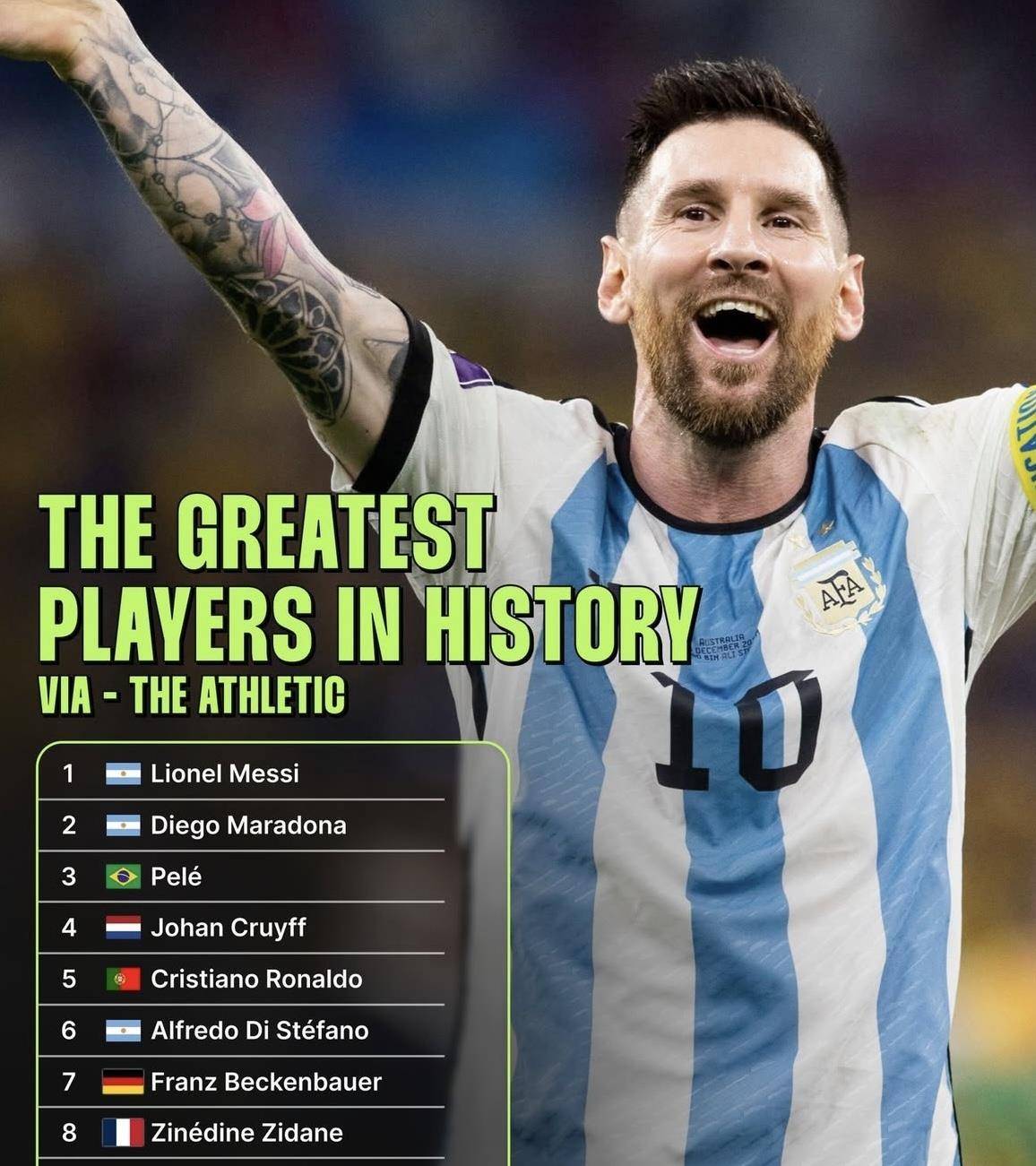 2026世界杯赛程,世界杯球队,足球预测,世界杯投注,赛事直播最近,一份由知名媒体The Athletic发布的“足坛历史十大球星”榜单,把球迷圈给彻底点炸了。 争议的焦点不是梅西力压贝利、马拉多纳登顶第一,这三位“球王”的排序如今已没多少人会去较真。