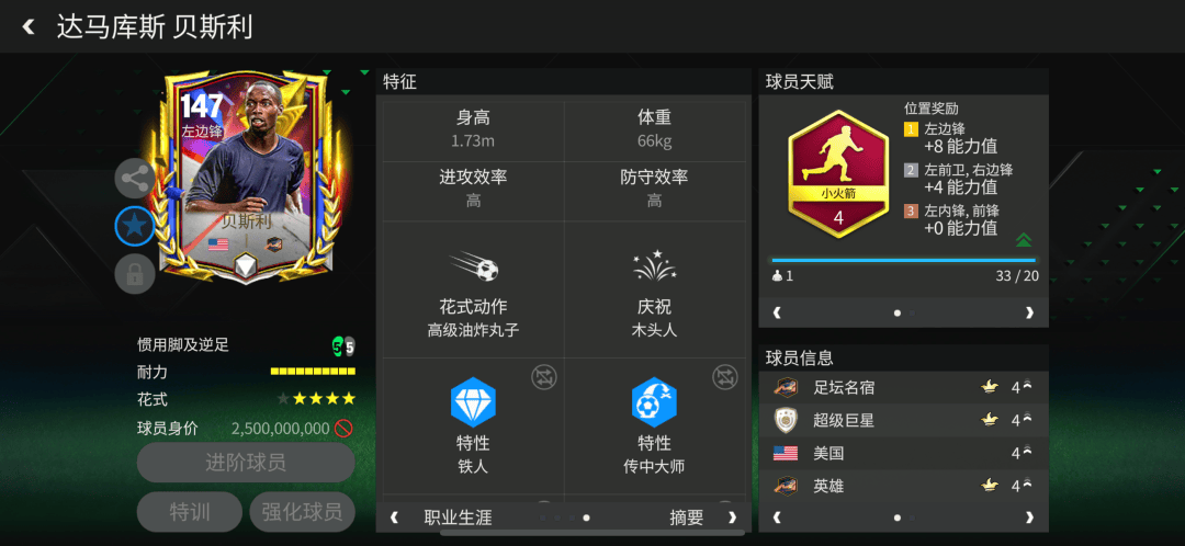 纪录粉碎者活动中,贝斯利的球员卡配备了小火箭天赋,对他的冲刺速度、远射、传中、盘带、控球五项数据都有提升。花式方面,高级油炸丸子搭配四星花式星级确保了他的边路突破能力。