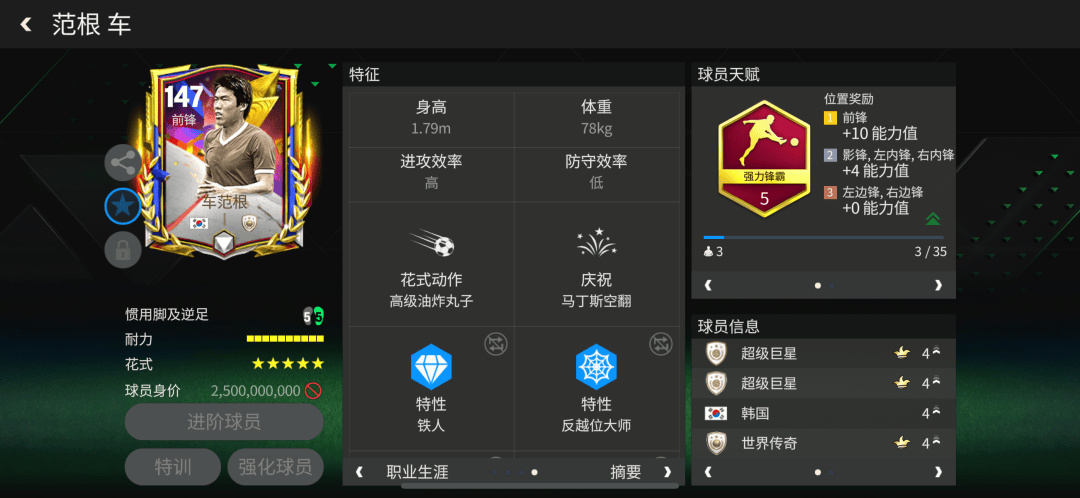 纪录粉碎者活动推出的车范根配备强力锋霸天赋,提升了他的加速、射门、抢点、头球、力量五项关键数据。花式方面,高级油炸丸子花式搭配五星花式星级让他拥有了稳定的盘带推进能力。