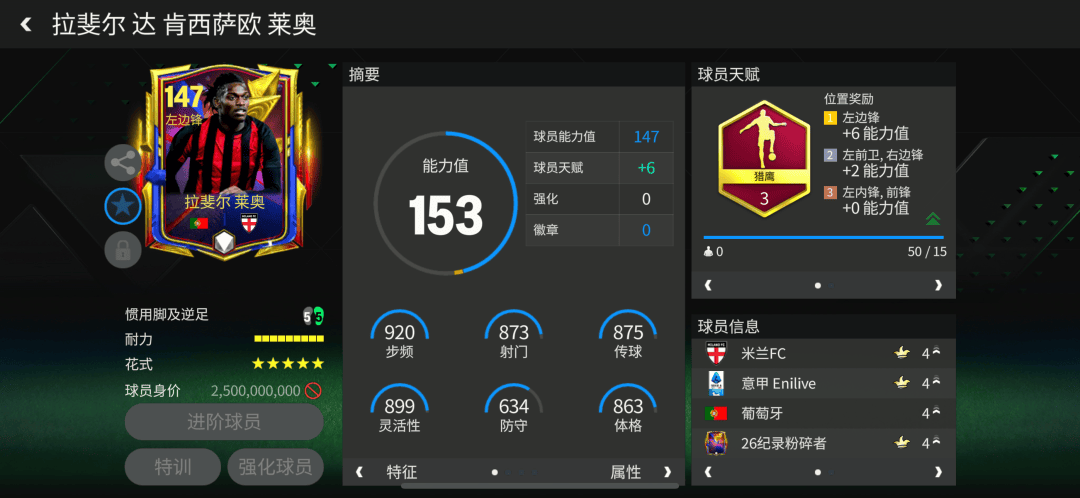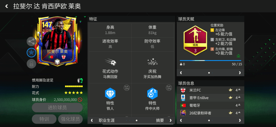 纪录粉碎者莱奥配备了猎鹰天赋,对他的加速、射门、传中、弧线、盘带五项数据都有提升。花式方面,身材高大的莱奥配备了马赛回旋,搭配五星花式星级,莱奥的持球进攻能力相当出色。