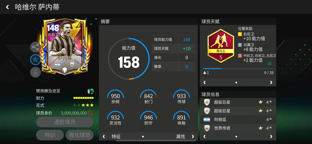 萨内蒂推出的纪录粉碎者球员卡配备了角斗士天赋,这项边后卫主流天赋对他的加速、传中、人盯人、铲断、拦截五项数据提升显著。双高的攻守效率也让萨内蒂在边路整体存在感大大增强。