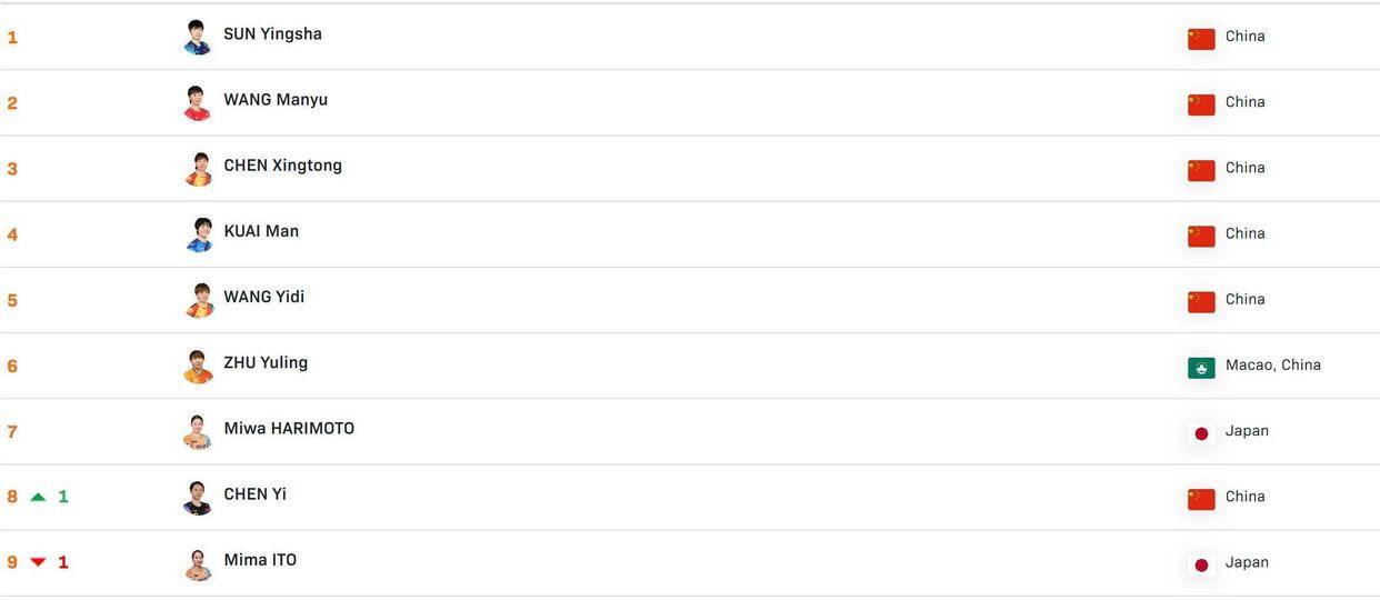 陈熠从二线队员冲击至世界前十的过程典型反映了这种机制。 她的积分反超伊藤美诚60分,升至第8名,靠的是在中国大满贯等赛事中的稳定表现。 而石洵瑶以2585分排名第11位,正紧盯着前十门槛。