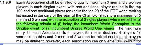 那么,这条新规具体是怎么运作的呢? 根据国际乒联的官方手册,下届世锦赛的单打名额获取渠道分成了三个清晰的层次。 最基础的一层,是每个协会原则上最多可以派出3名男选手和3名女选手,这6个是“保底”名额。 第二层是奖励机制:如果该协会拥有世界排名前100的选手,可以增加1个名额;如果拥有世界排名前20的选手,可以再增加1个名额。