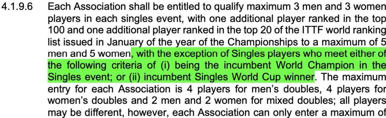 让我们先来看看国际乒联规则手册的最新版本。 其中明确规定了下一届世界乒乓球锦标赛单打项目参赛名额的获取方式。 规则明确指出,每个协会的基础名额依旧是男女各三人。 如果一个协会有运动员的世界排名进入前一百,可以额外增加一个名额;若有运动员进入世界前二十,则可以再增加一个名额。 按照这样的规则计算,像中国队这样的乒乓强国,通常情况下最多可以派出男女队各五人,总共十名选手参加单打比赛。 在2025年卡塔尔多哈举行的世乒赛上,中国队正是按照这个规则,派出了包括樊振东、马龙等在内的五位男选手,以及孙颖莎、陈梦等在内的五位女选手。