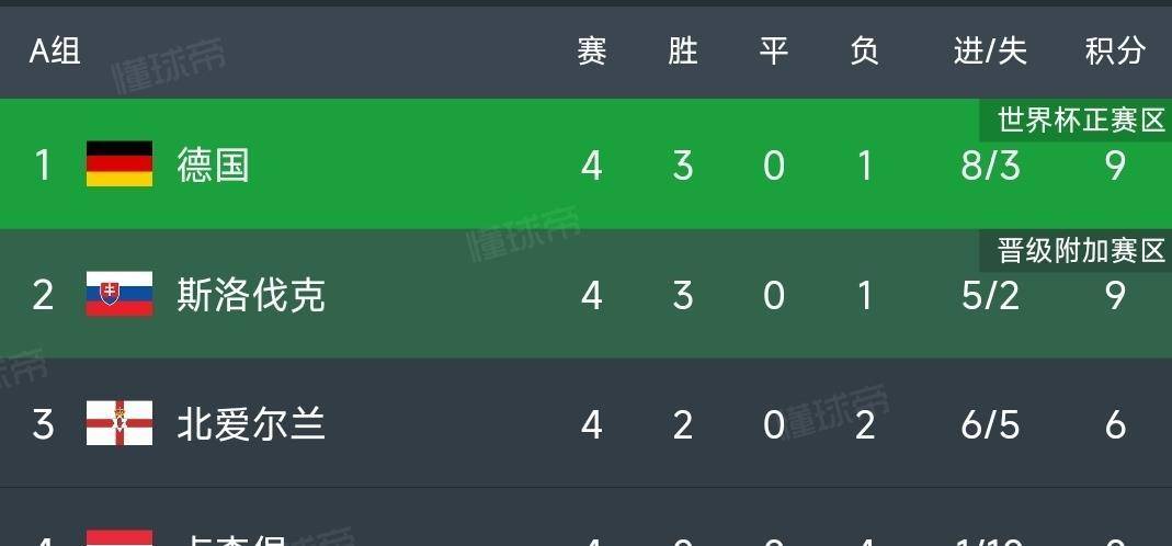 A组的竞争异常激烈,德国、北爱尔兰和斯洛伐克三队同积6分,形成了罕见的三角竞争局面。