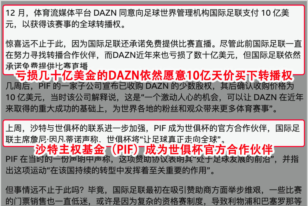 沙特近年来在足球领域投入了庞大资金,并在多个领域与国际足联展开深度合作,不仅是世俱杯的重要赞助商,还是2034年世界杯唯一的申办国。可以说,在多方面都进行了出色而持久的努力。