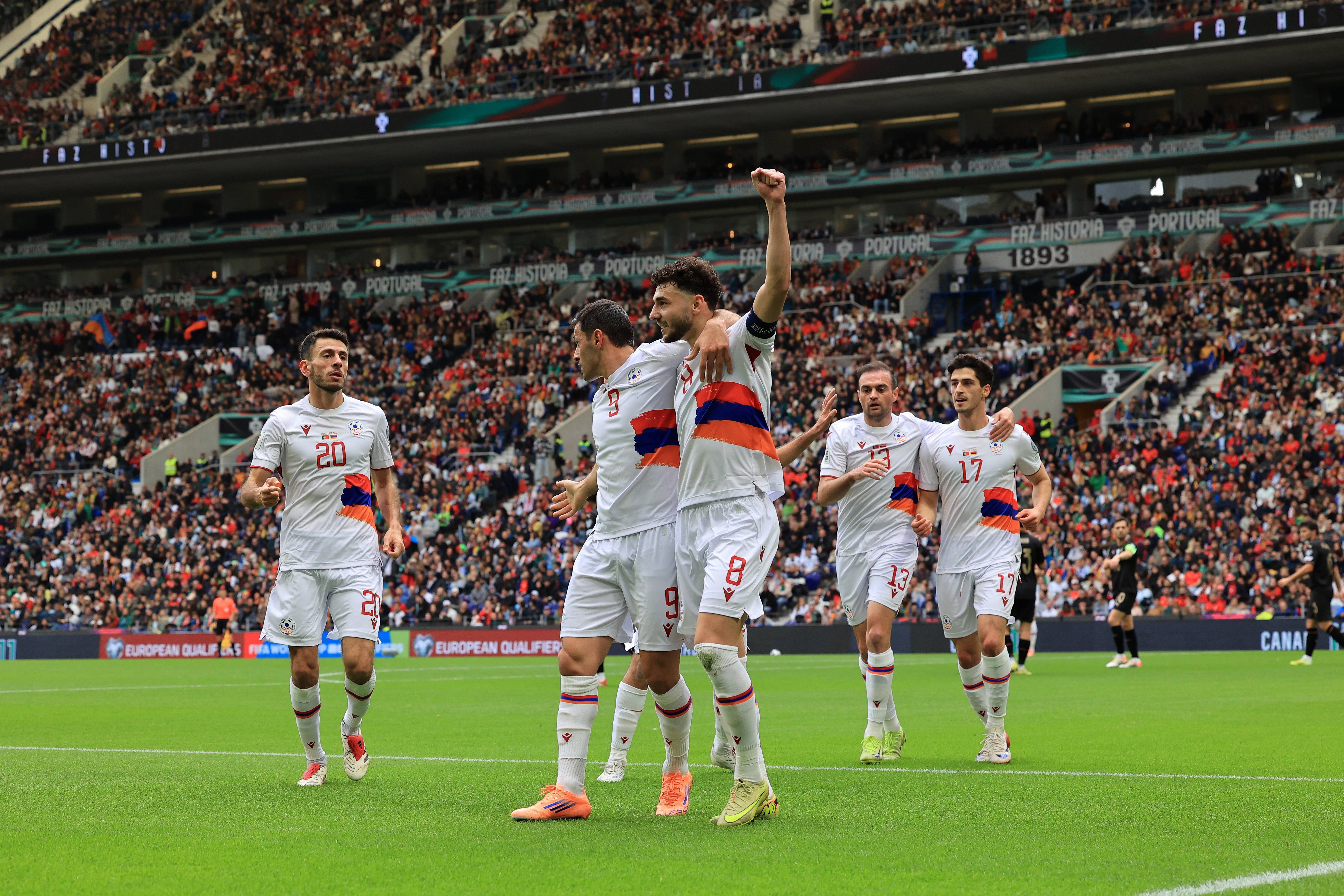 11月16日,亚美尼亚队球员斯佩尔扬(中)入球后与队友庆祝。 新华社/欧新
